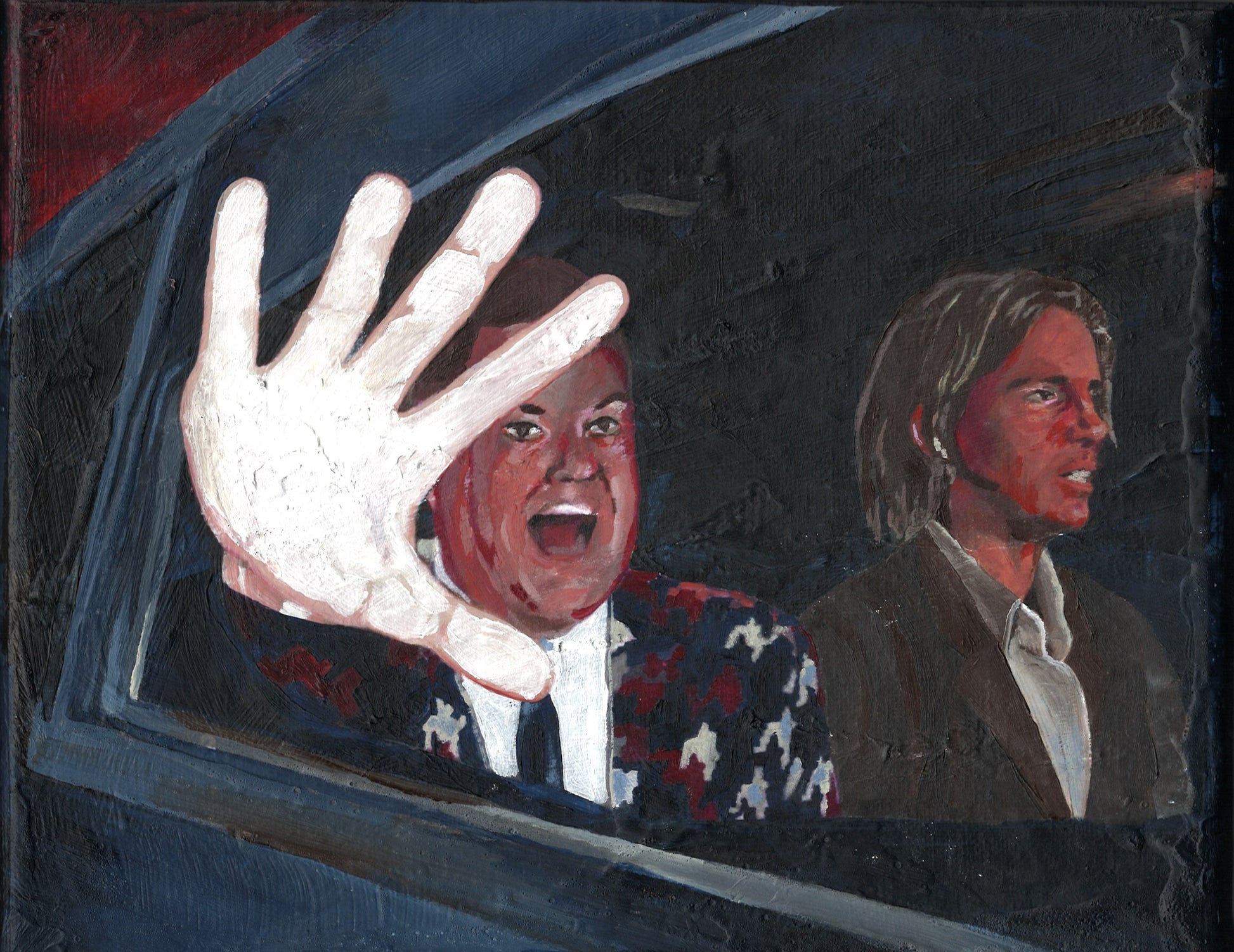 original acrylic painting of ross mathews from rupauls drag race caught by paparazzi in the car beside critically acclaimed poet eileen myles. printed on a unisex garment-dyed t-shirt and ranges from size S to 4XL. 100% cotton